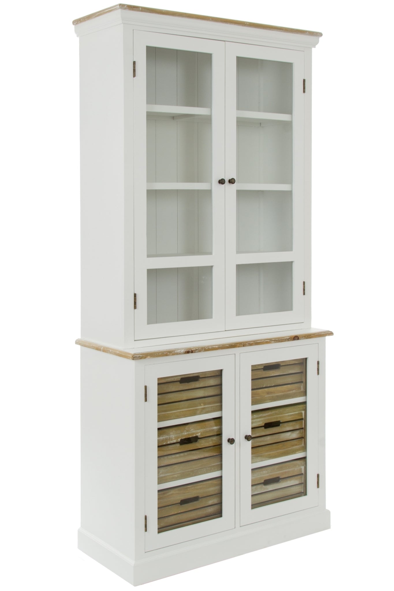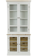 • VIELSEITIGE NUTZUNG: Die zweiteilige Vitrine ist oben und unten mit Glastüren ausgestattet und bietet feste Ablagen sowie stabile Holzkörbe mit Eingriffen für flexible Aufbewahrungsmöglichkeiten.