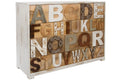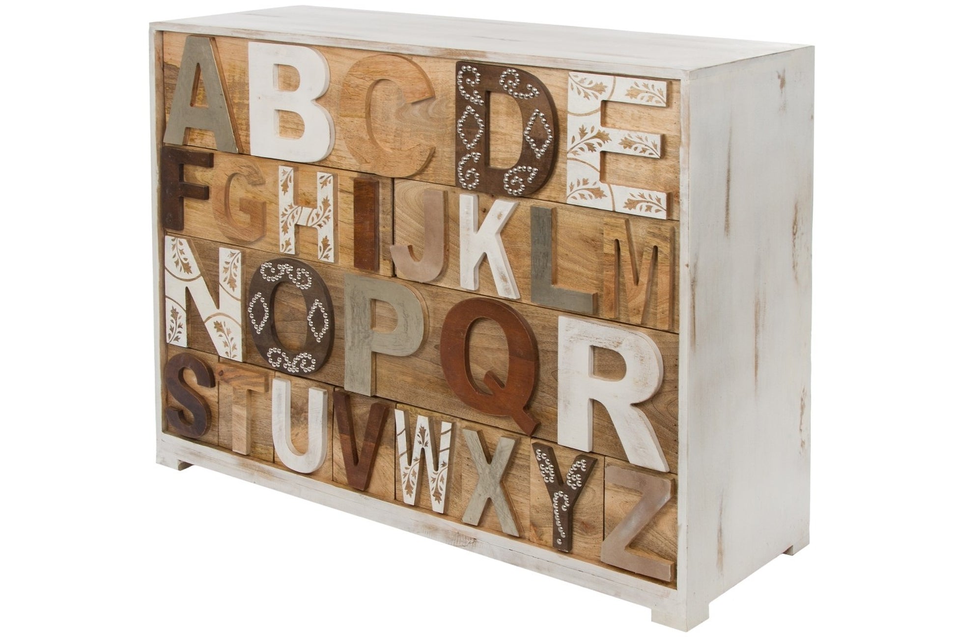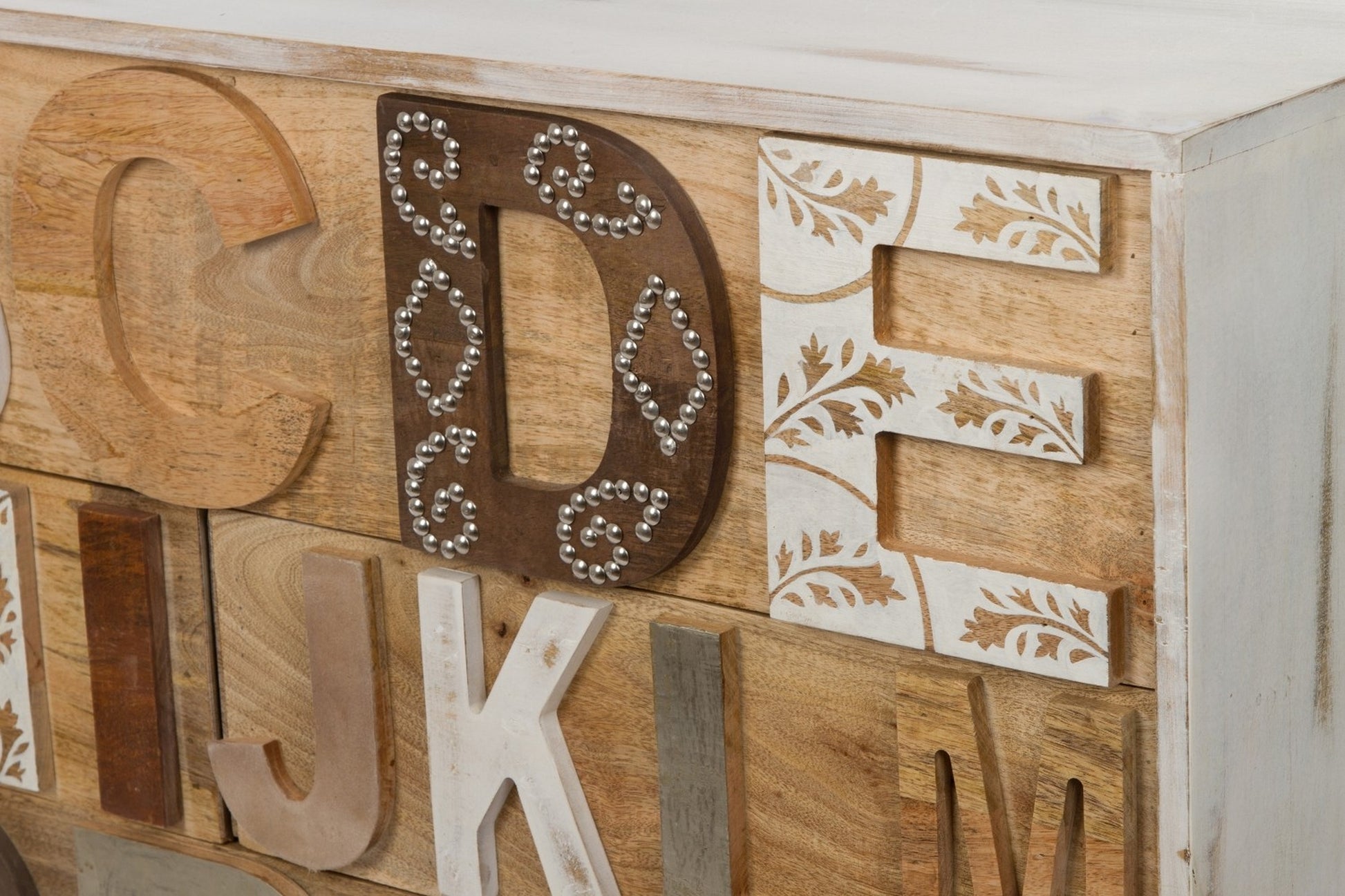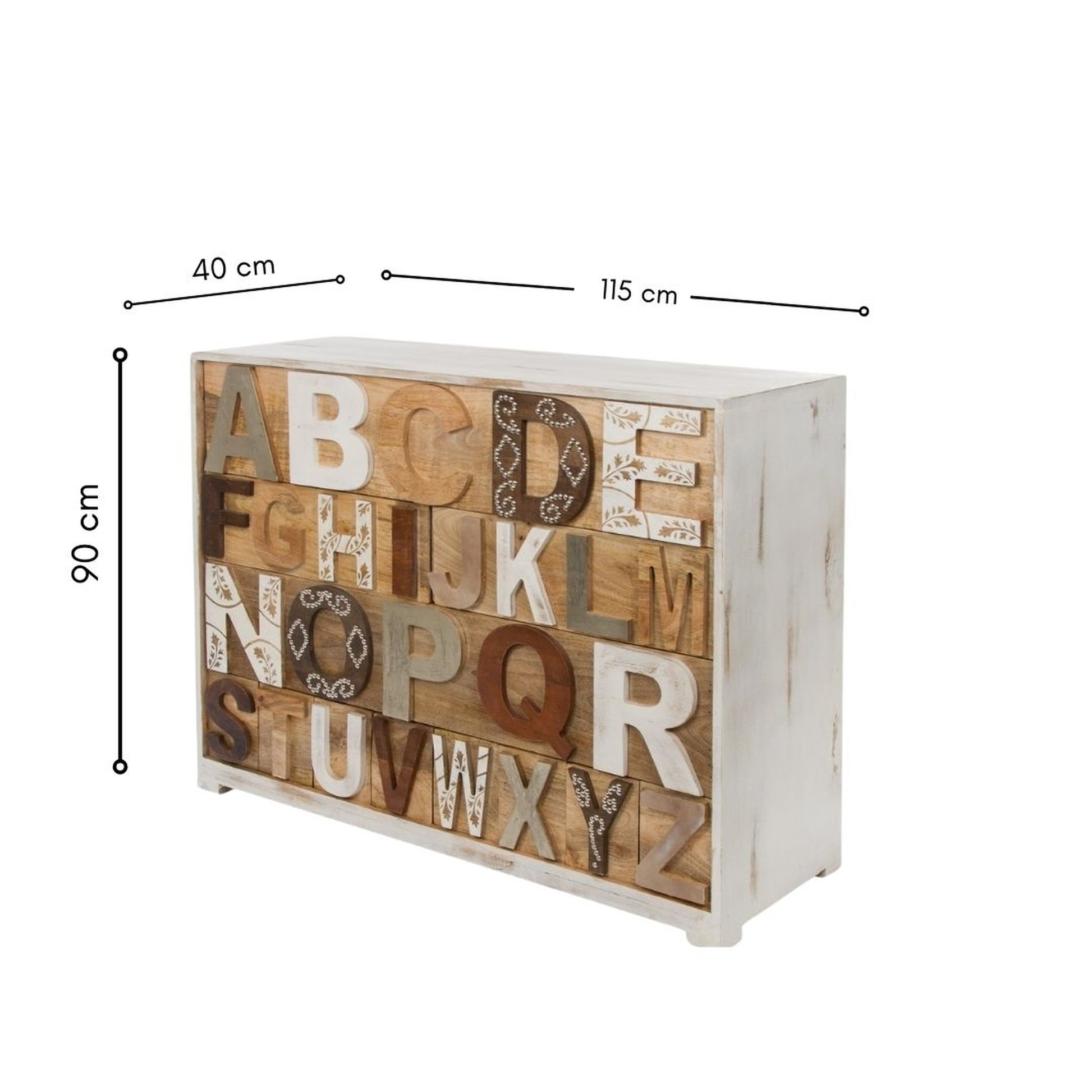 Die ABC-Design Kommode "Wincent" mit den Maßen 90x115x40 cm ist ein dekoratives Möbelstück, das mit aufgesetzten Buchstaben verziert ist, was ihr einen einzigartigen und charmanten Charakter verleiht.
