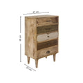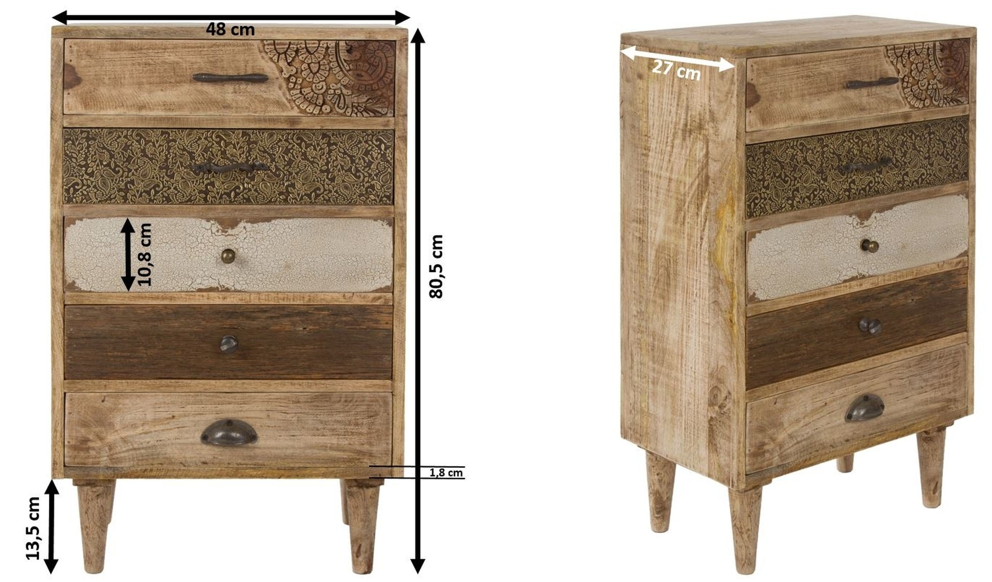 Die kleine Kommode "Levi" aus Mangoholz und Materialmix vereint charmantes Design mit praktischer Funktionalität. Mit ihren 5 geräumigen Schubladen bietet sie ausreichend Stauraum für die Aufbewahrung Ihrer persönlichen Gegenstände. Ob im Schlafzimmer, Wohnzimmer oder Flur, diese Kommode fügt sich harmonisch in Ihr Zuhause ein und sorgt für eine organisierte Atmosphäre.