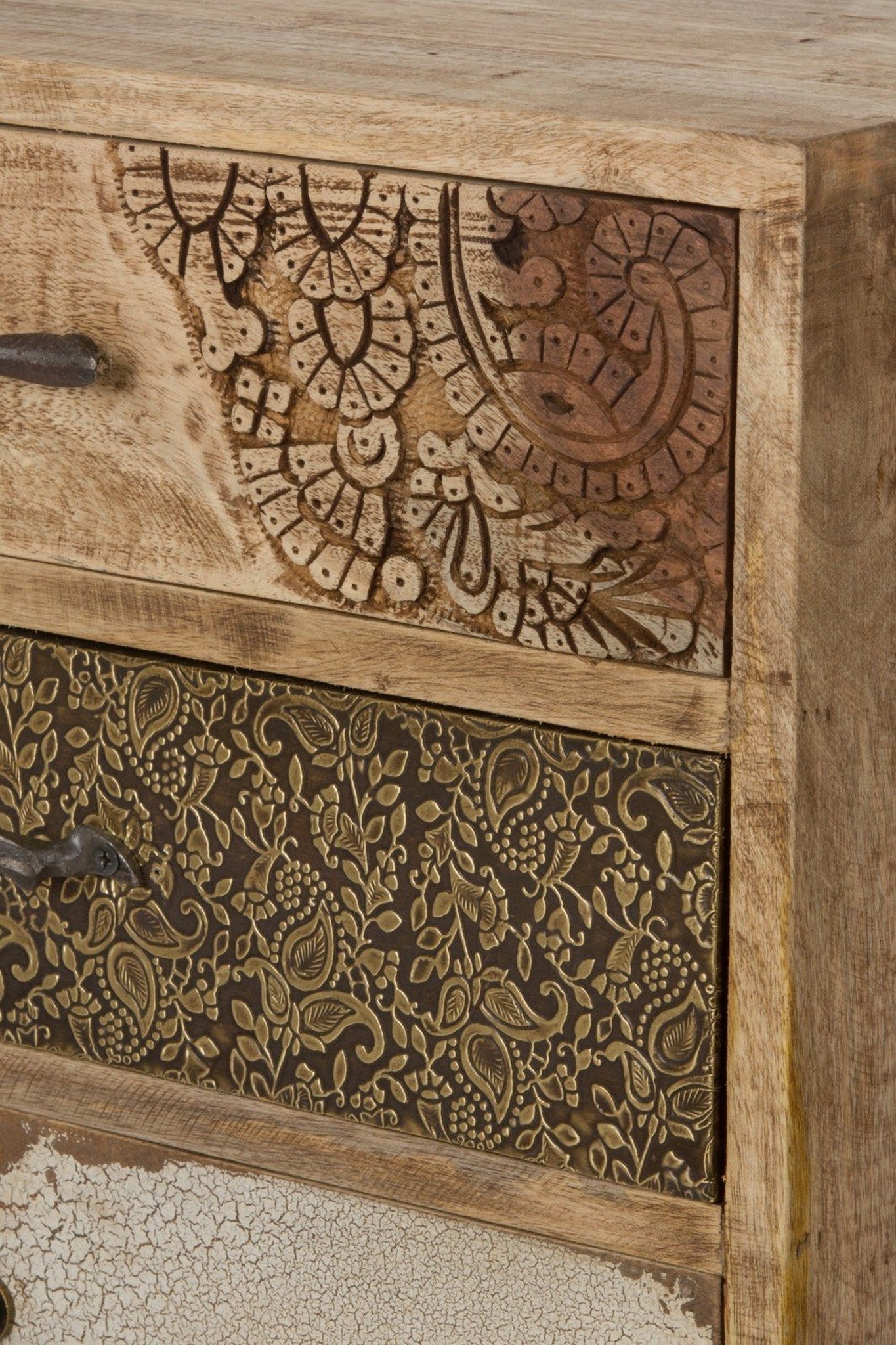 Die Fronten der Schubladen sind teilweise mit Felloptik gestaltet, was dem Möbelstück einen natürlichen und ansprechenden Look verleiht. Diese ästhetische Wahl betont die Schönheit des Mangoholzes und ergänzt den Materialmix auf eine elegante Weise.