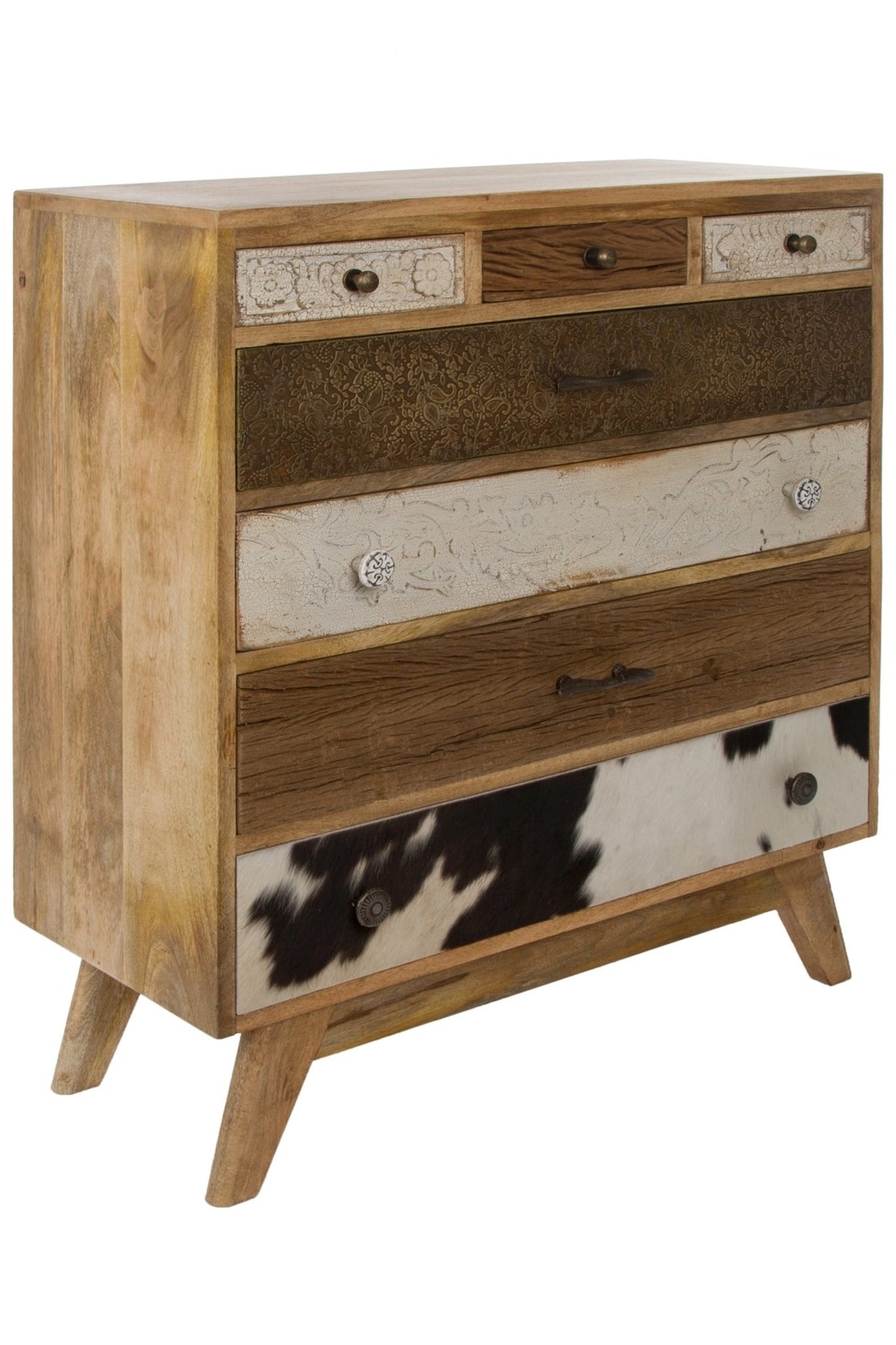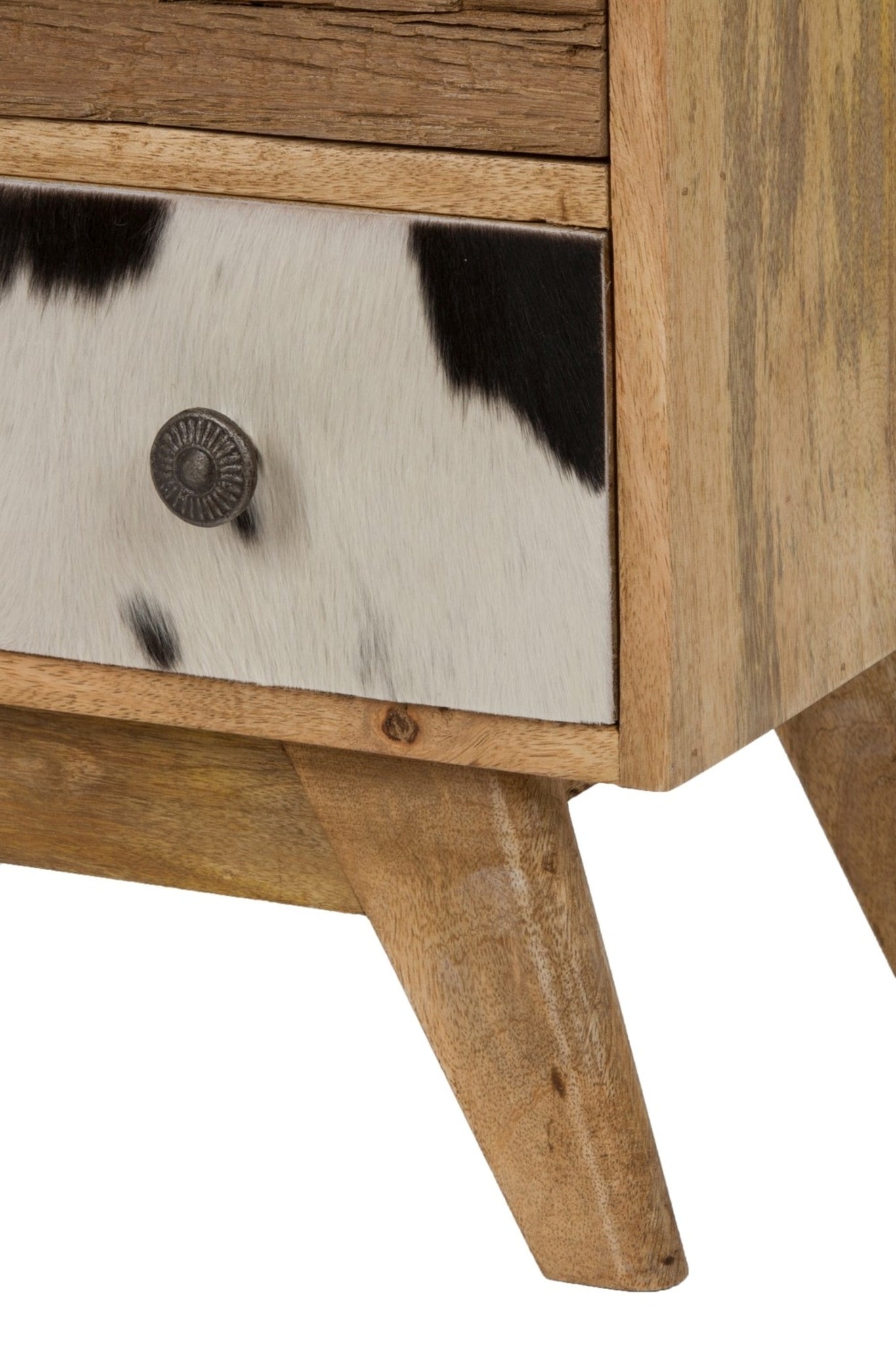 Die Fronten der Schubladen sind teilweise mit Felloptik gestaltet, was der Kommode einen natürlichen und ansprechenden Look verleiht. Diese gestalterische Entscheidung unterstreicht die Schönheit des Holzes und verleiht dem Möbelstück eine organische Note.