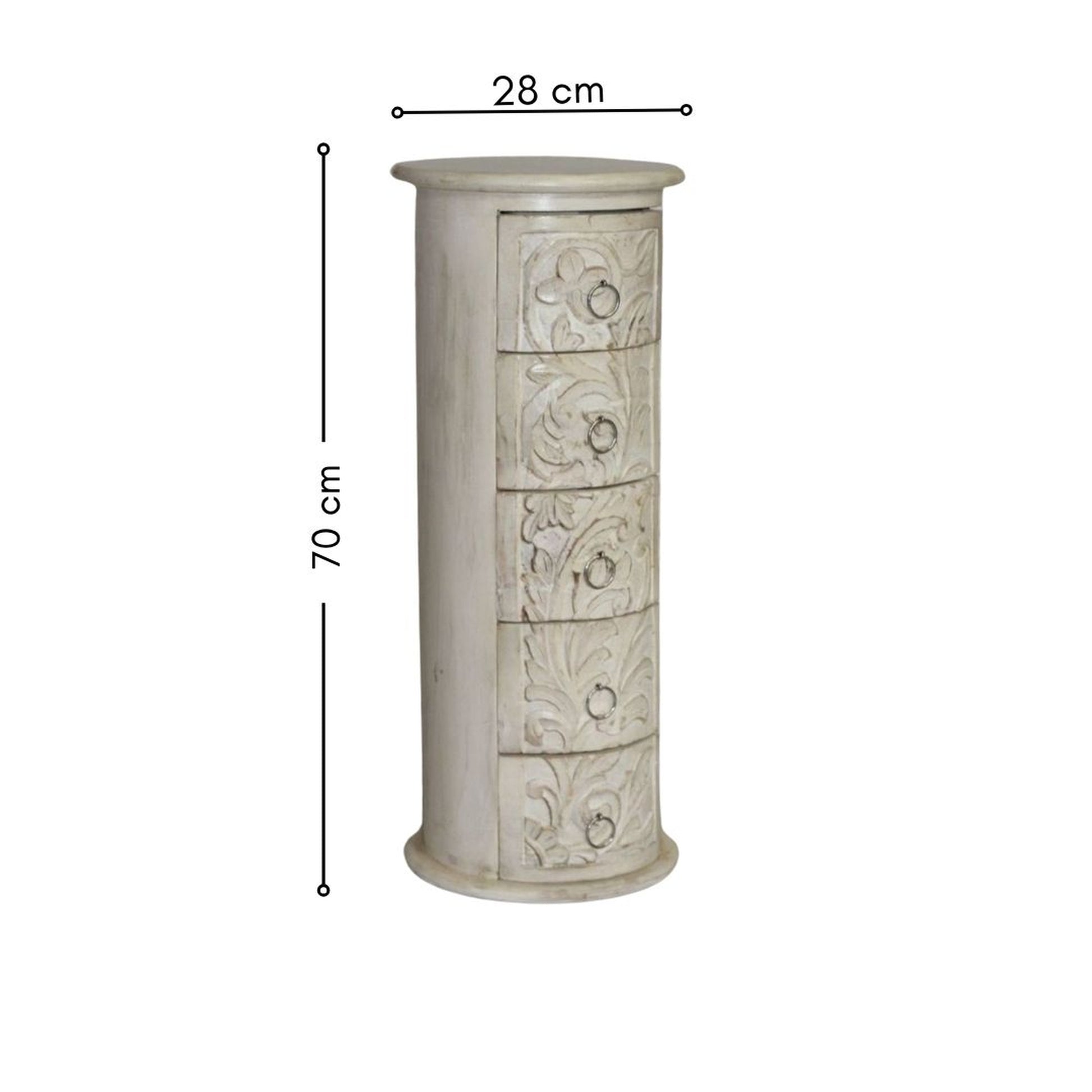 Entdecken Sie die einzigartige Schubladen-Säule "Silas", die mit künstlerischen Details und natürlicher Schönheit Ihr Zuhause bereichert. Jede der fünf Schubladen ist mit individuellen Schnitzereien versehen, die dem Raum eine besondere Note verleihen und kunstvolle Handwerkskunst demonstrieren. Diese detailreichen Schnitzereien machen jeden Schrank zu einem Kunstwerk und setzen stilvolle Akzente.
